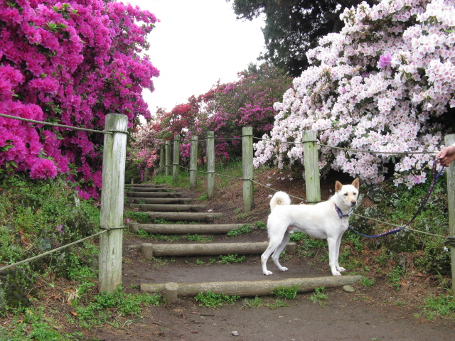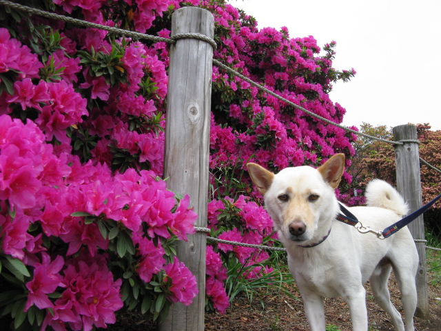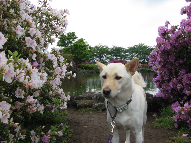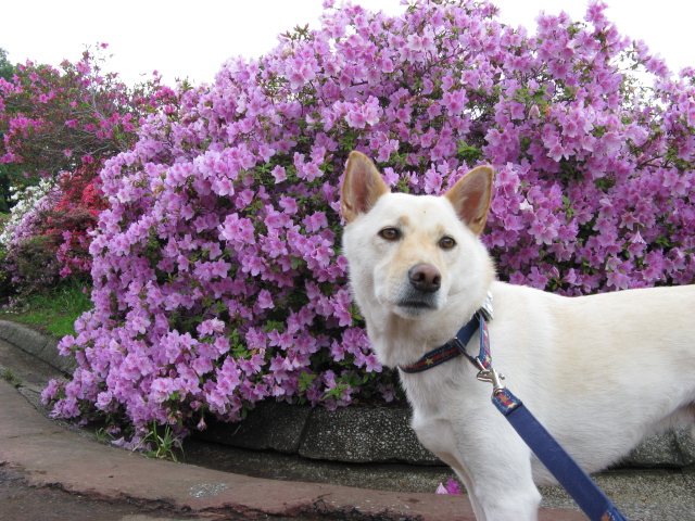 白い空ちゃんが、はんなりしたツツジの前で映えますね。