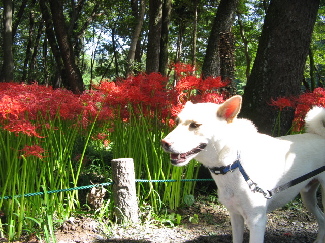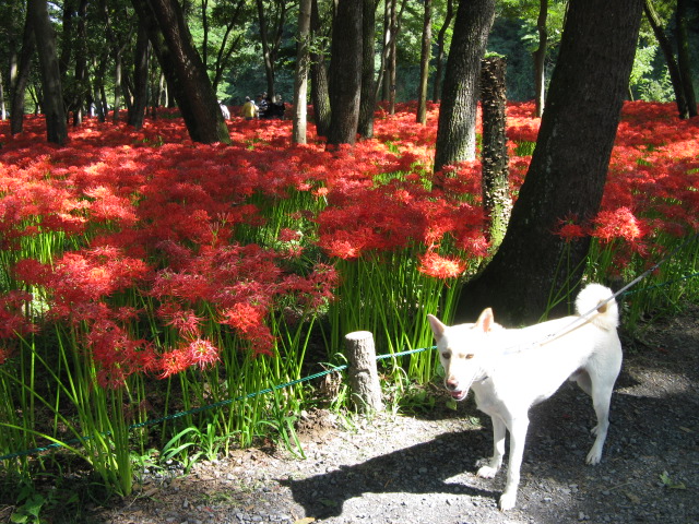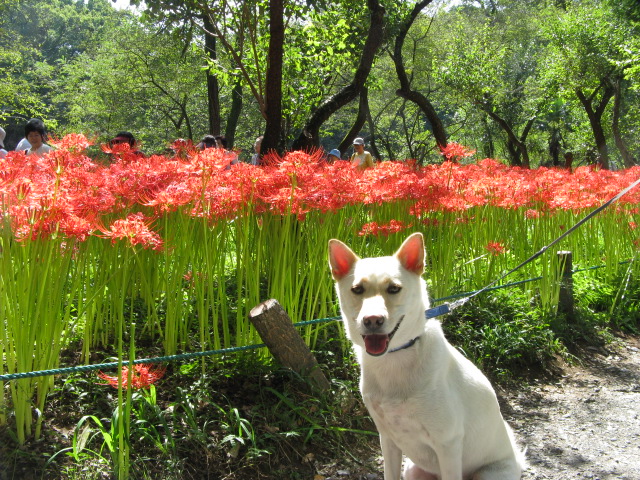 空くんの優しいオフホワイトの毛色が彼岸花の赤によく映えて,モデルさんみたいですね♪