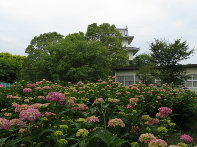 そして騎西城のお堀り池は周辺にたくさんのあじさい。池にはたくさんの蓮の花・・・