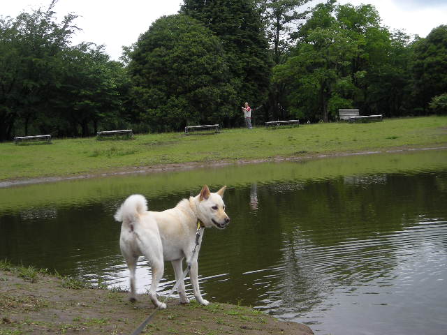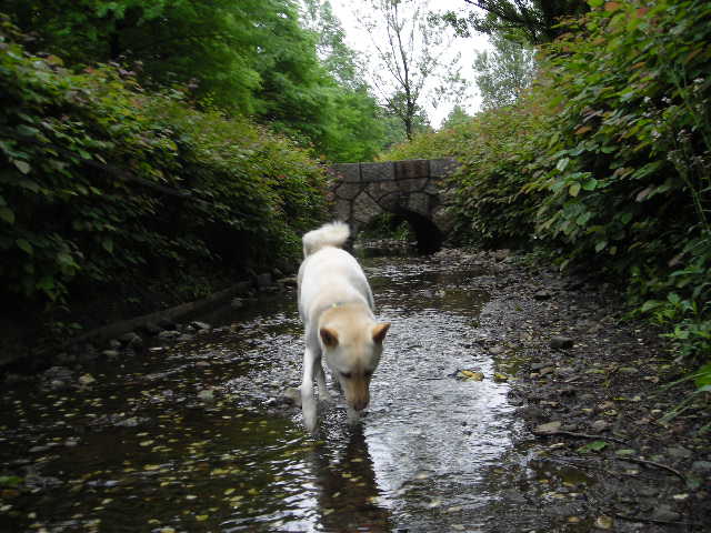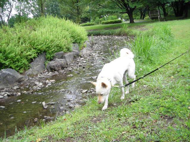 池に流れ込むせせらぎ・・・・あたりを見回しても、『犬はダメよ!』の看板立て札は見つからなかったのでリードを伸ばしてあげたら・・・