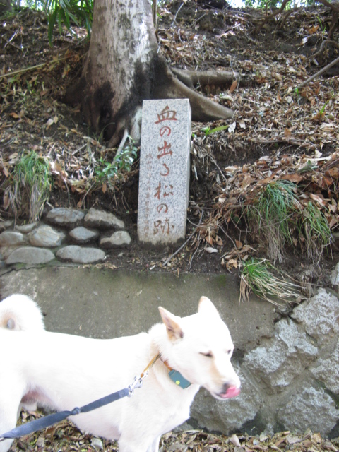 言い伝えによると、戦で城兵の血をたくさん吸った松があって、その枝を折るとたくさんの血が噴出した・・・って説のようです^_^;