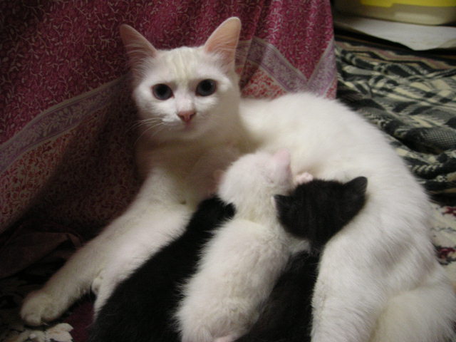 白いのと黒いのと・・・まだお目目が開いたばかりの仔猫ちゃんです!親猫に似て美猫ちゃんになる予感