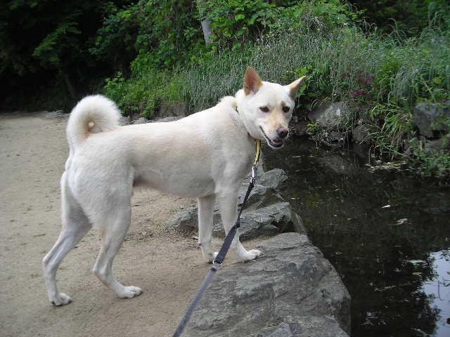 池に流れ込むせせらぎ・・・・あたりを見回しても、『犬はダメよ!』の看板立て札は見つからなかったのでリードを伸ばしてあげたら・・・
