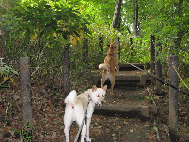 つり終わった後の紐についたままのサキイカが所々落ちているのです。(口に入れる気マンマンの2頭・・・)