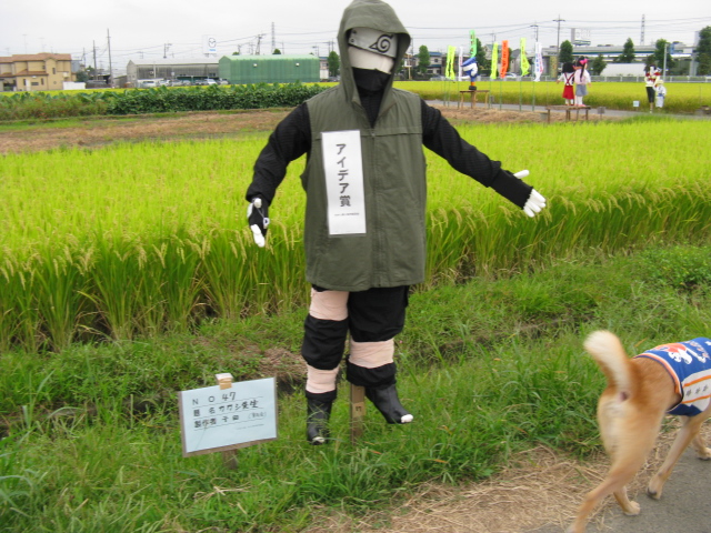 黄金色に変わりつつある後は収穫を待つばかりの田んぼにたくさんの案山子たち。。。先日はここで『案山子祭り』なるものも開かれていたらしい。。。私興味津々です!