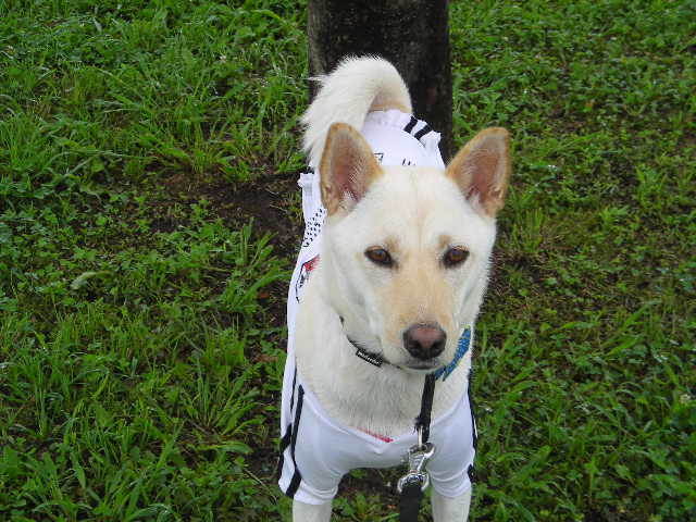 はい洋服は水の跳ね避けのために着せました。霧雨だったのでレインコートまでは行かなくてもよさそうだったし・・・