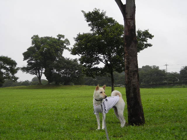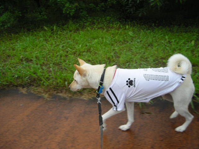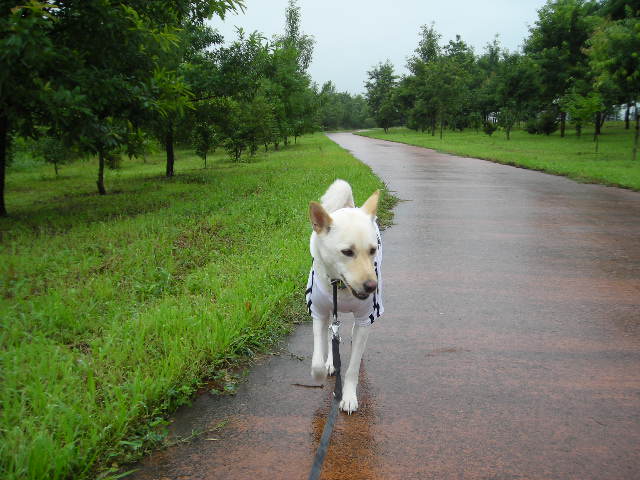 濡れるのが嫌みたいで草むらにも入っていかず、無理やり歩かせても