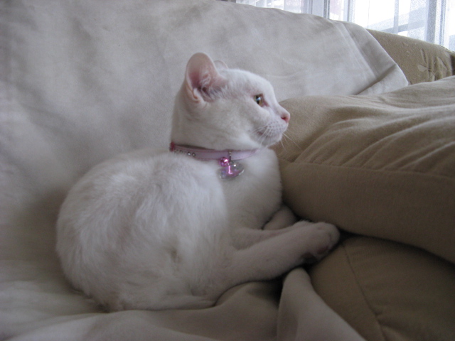 昨日まではソファの下だったけど今日からはソファの上へ・・・今日は雨降りで床は冷たいもんね。