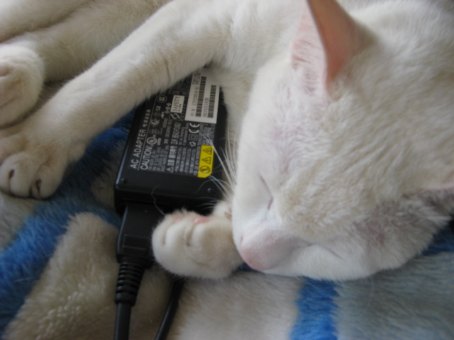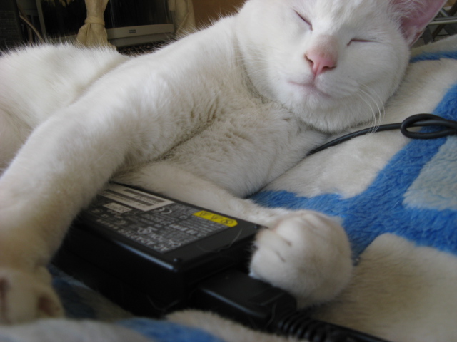 お仕事が終わったらお昼寝タイム・・・PCのACケーブル抱えてお昼寝です♪