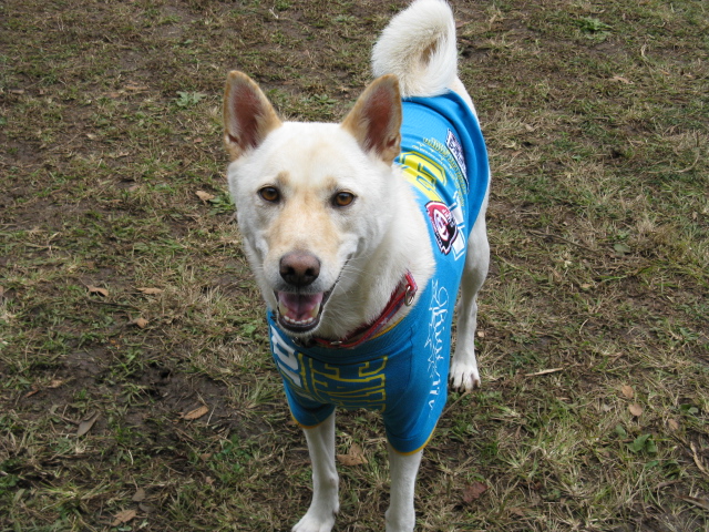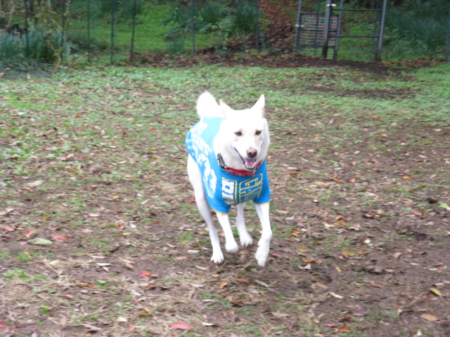 空ちゃんの白い毛にブルーの洋服が映えてて