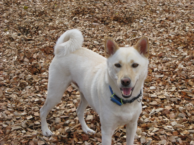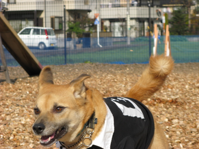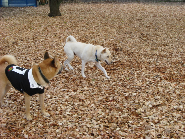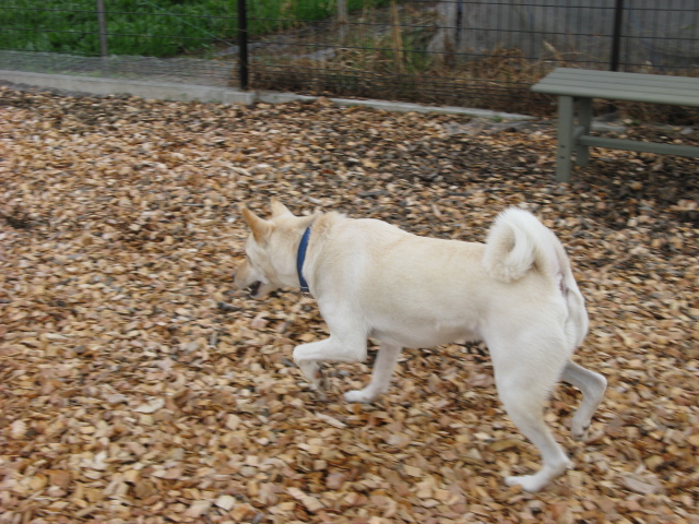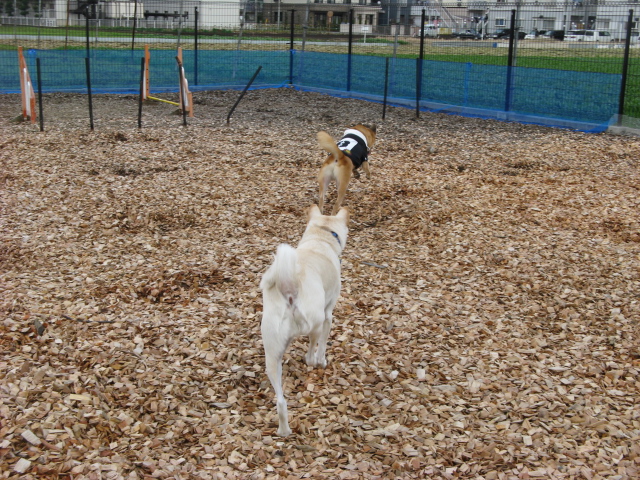 ウッドチップのドッグランは空は初体験!わ~~い♪