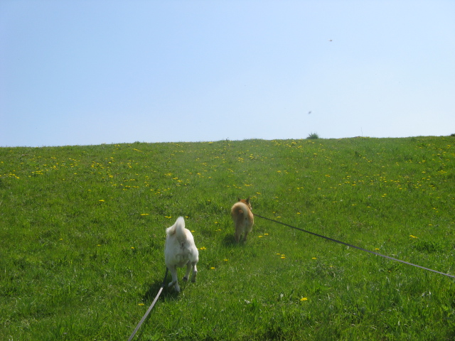タンポポの土手をグイグイ登ってドッグランを目指します!!