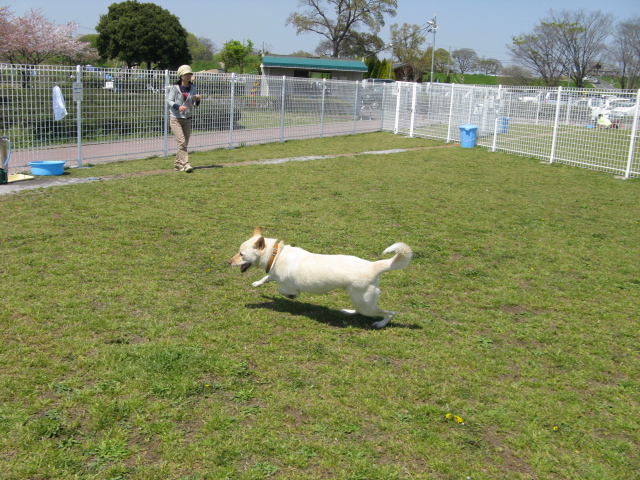 せっかく来たドッグランだもん、体に水をかけてあげたりしながら、なんとか走らせてます。