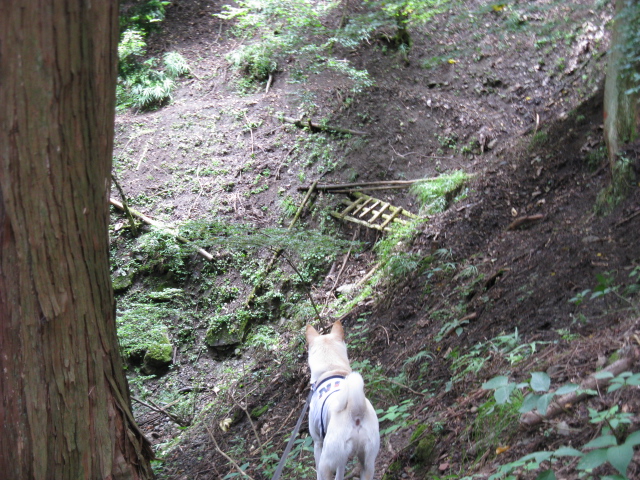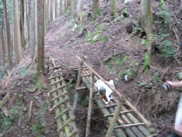 お次は丸太橋・・・四本の丸太は隙間が開いてて苔むして滑りそうだし、ぐらぐら揺れるし、手すりは折れてブラブラしてるの。