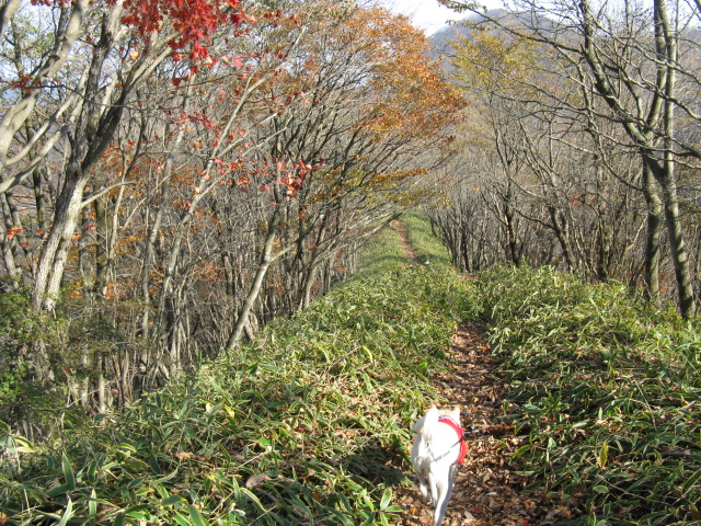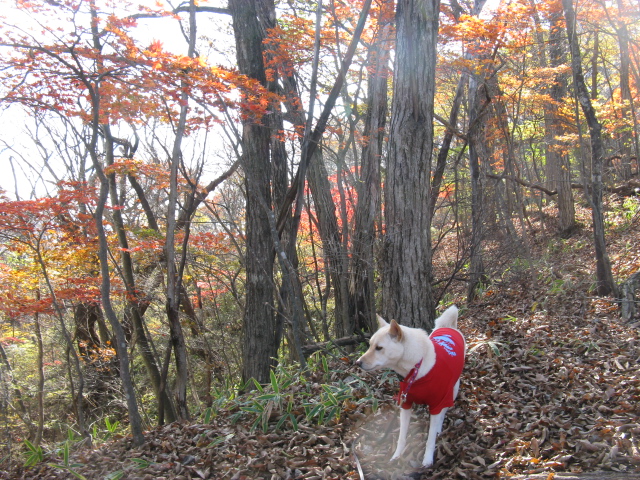 尾根道をずっと歩いてるんだけど、湖側は葉が落ちて枯れ枝なんだけど、反対側は紅葉真っ盛りなの。