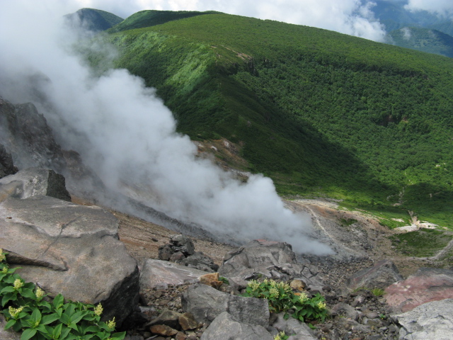 茶臼岳は活火山です。山頂付近にはこうして所々岩の隙間から熱い蒸気が噴出しています。