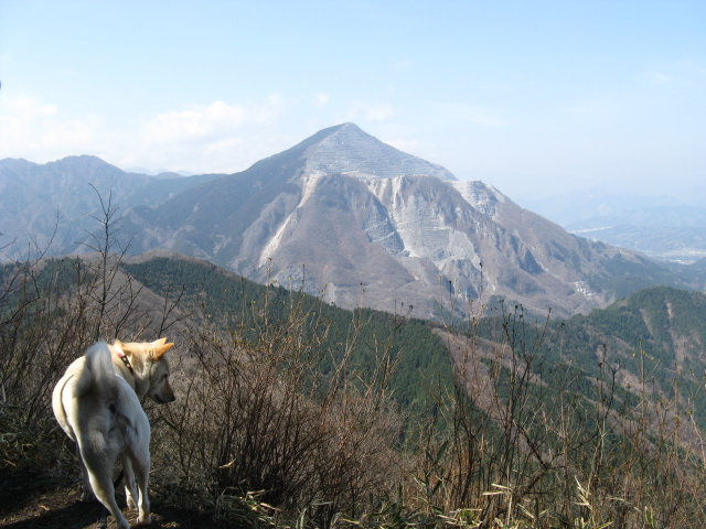 手前の白いのが山頂直下の採掘場、その下に秩父の町並み~~