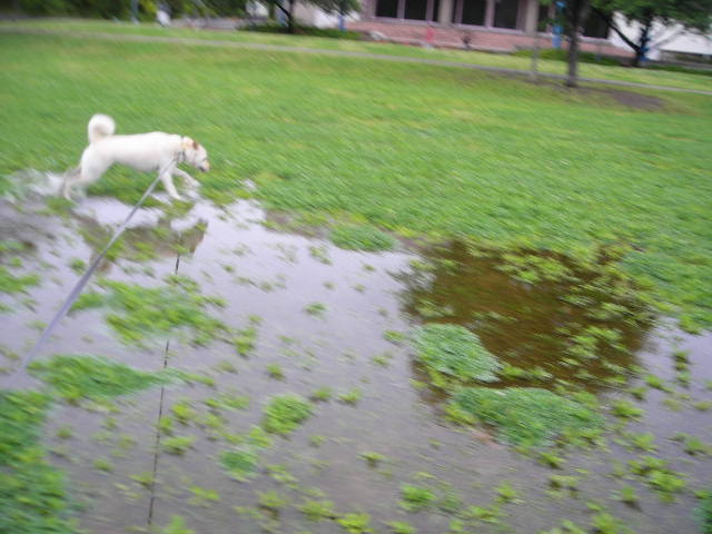 お水は苦手なハズなのに・・広場の水溜りはテンションが上がるようです・・