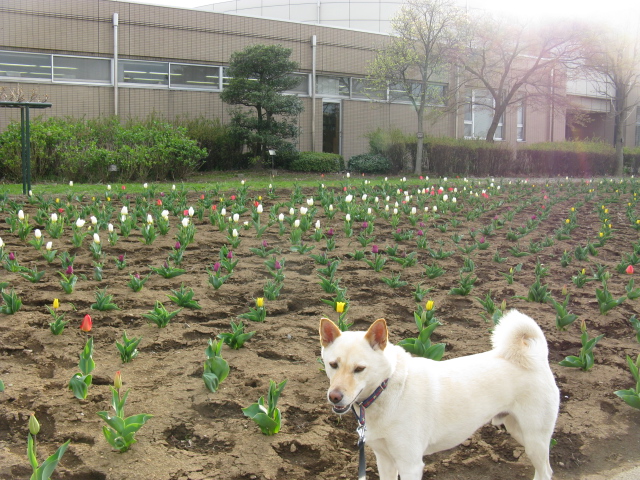 花壇のチューリップはもう少しですね。どうやら見頃は桜が散ってからになりそうです。