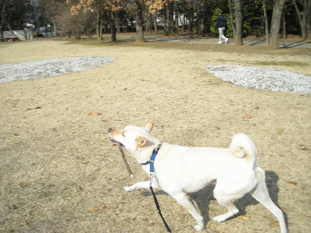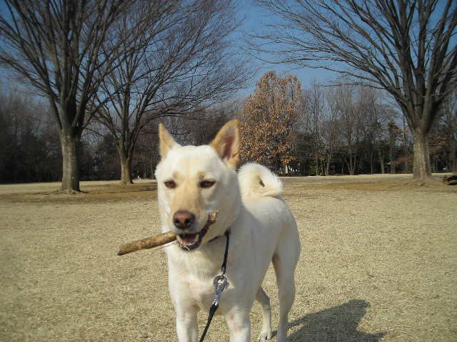 お気に入りの枝を見つけると、他のワンちゃんに自慢しに行きます。そしてなぜか偉そうな歩き方になります。