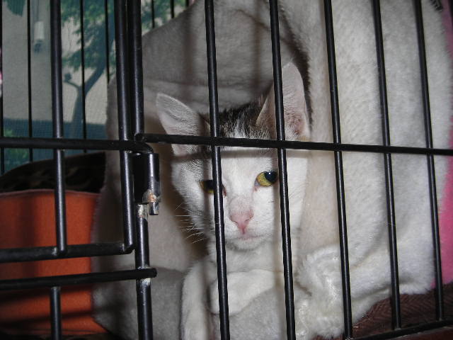 海はケージの一番奥の角に頭をつけて、それは小さい体をさらにちっちゃくして震えていました(T_T)