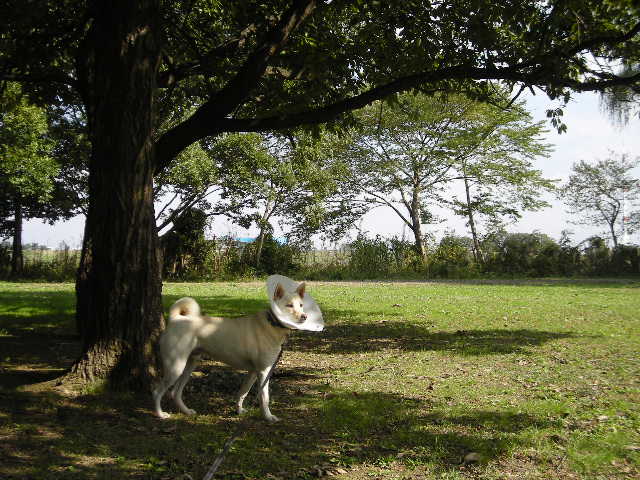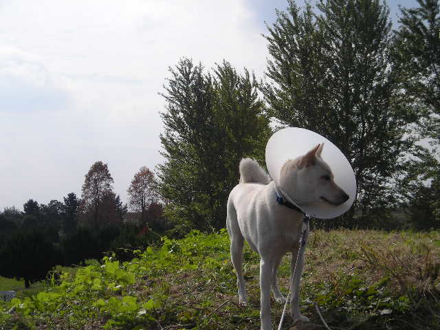 せっかくの良い景色の中の写真なのに、エリザベスカラーの愛犬で残念です