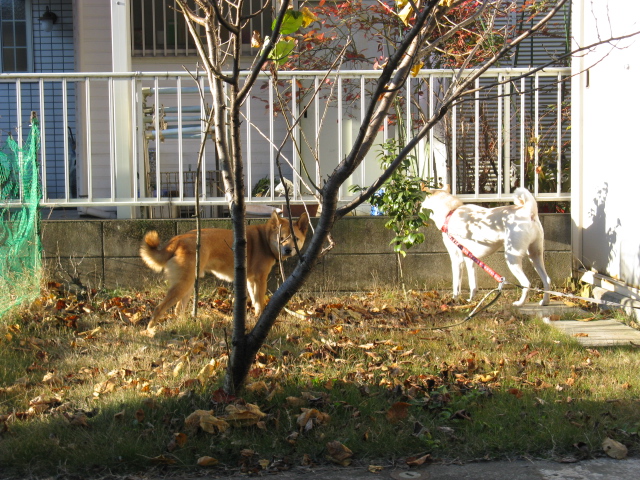 日が出てる日中は2匹をお庭に繋いでてみました。