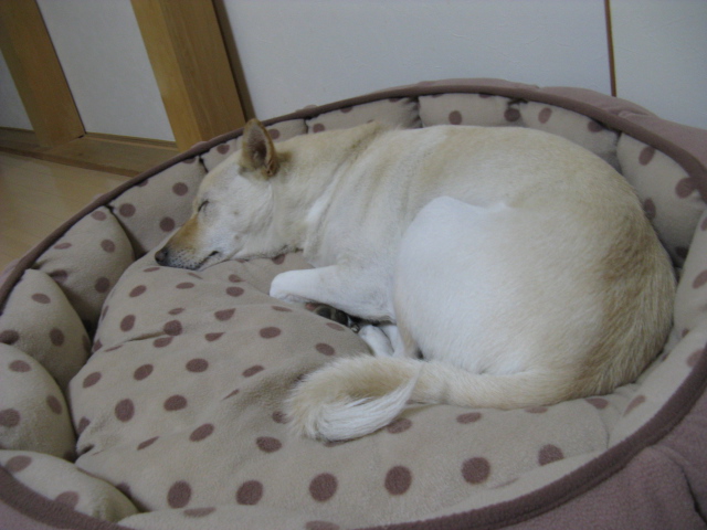 リキちゃんはお家から持ってきた王様のような立派なベッドで休んでいました。