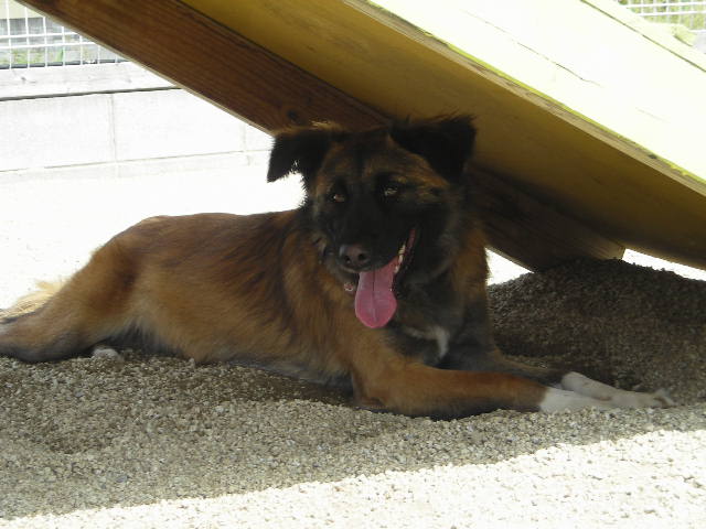 日陰探しの達人ミネバ様。砂を蹴ってつめたい場所に寝転びます。