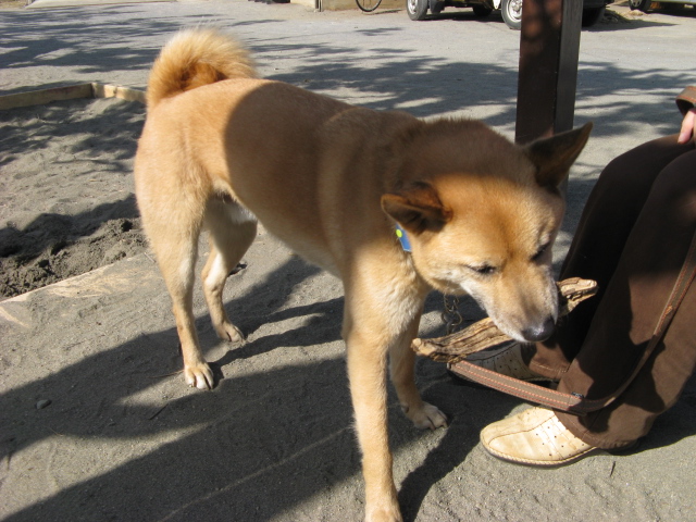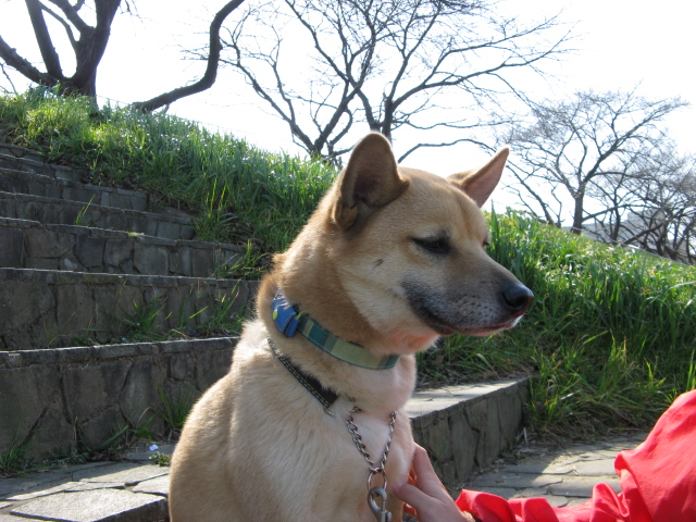 土手沿いの公園で・・・リキちゃん、大好きな枝を空に強奪されないようにママの後ろに隠れながら齧ります^^