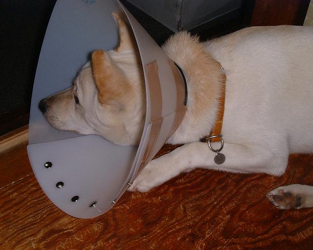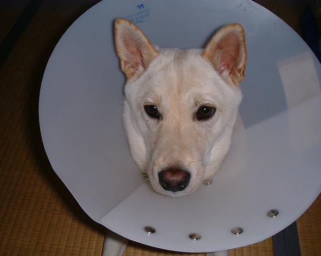 エリ・カラ(エリザベス・カラー)で、動きにくいし、空ちゃんもしばらくはかわいそうだけど、、