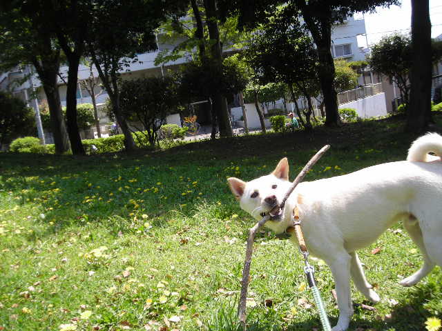 宝物はこうやって下に押し付けて遊びます。この枝にはかなり執着してました。