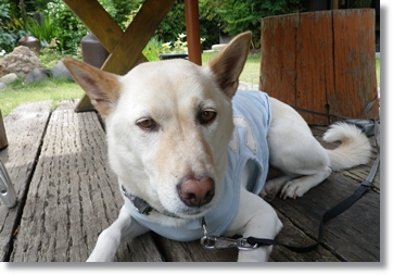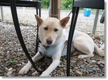空は大好きなカフェなので、テーブルの下の日陰の場所にもぐりこんでお利口さん・・・