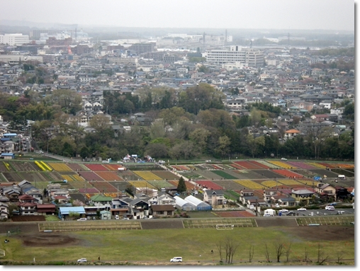 羽村のチューリップ畑がどれくらい大きいか、上から見るとよくわかります♪