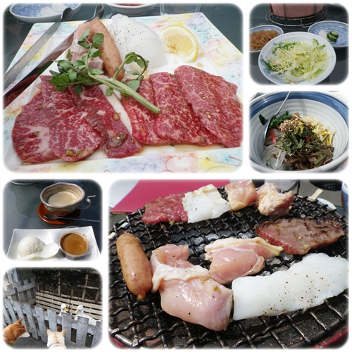 カルビと地鶏とイカとソーセージのセットですよ~そのほかサラダ、小鉢、おしんこビビンバがついて