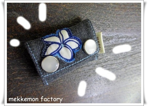 ブラックデニムをベースに、リードと同じ青いお花がワッペンのように縫い付けてあります♪