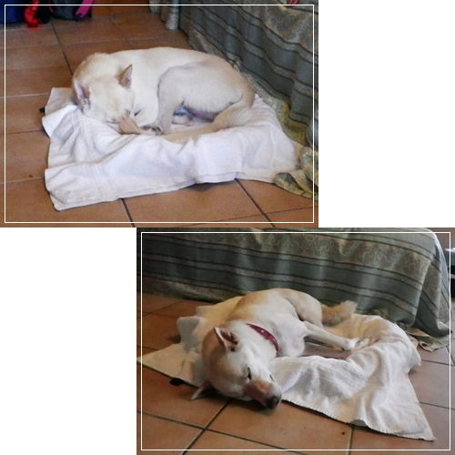 自宅から持ってきた大のお気に入り、子犬の時からずっと使ってるボロボロになったせんべいベッドさえあれば、場所が変われど大丈夫♪