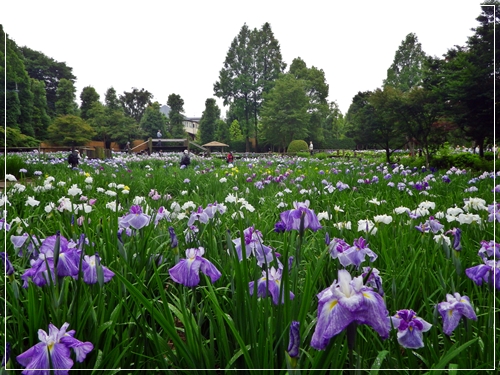 ひょうたん池のそばの駐車場から園内に入ってすぐに花菖蒲が満開!