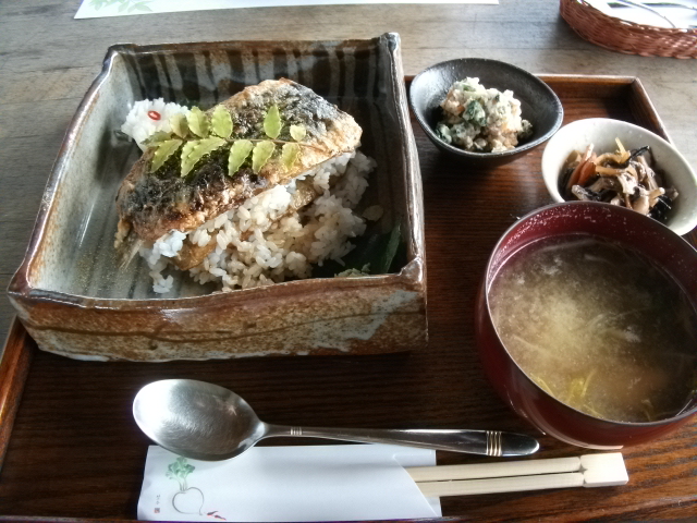 ご飯には鰻のたれのような味付けがしてあって、菜園の季節のお野菜がふんだんに入ってる付けあわせ、