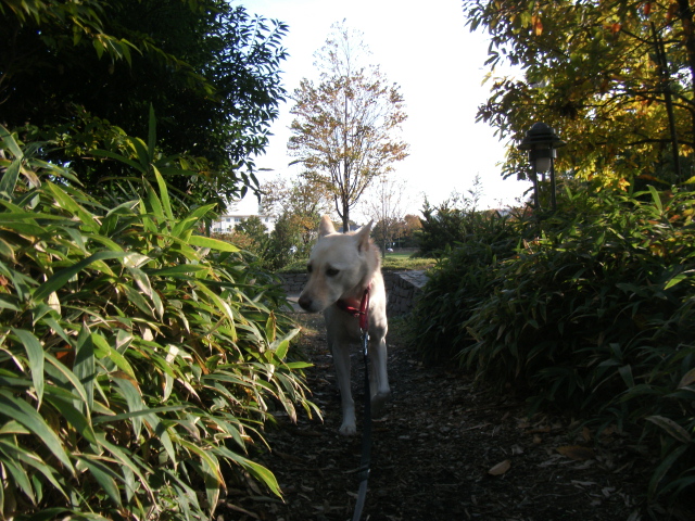 日当りのいいベンチを見つけて、やっと私の前に出て誘導♪