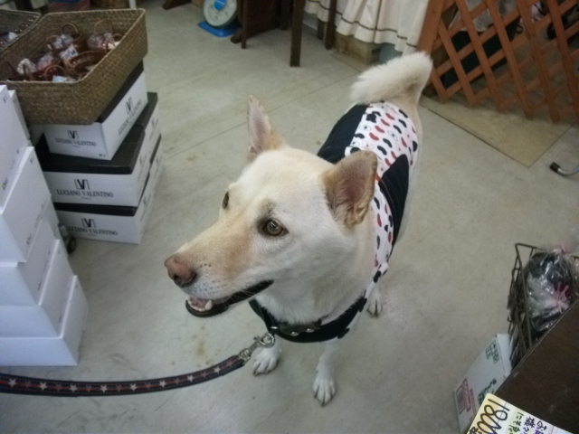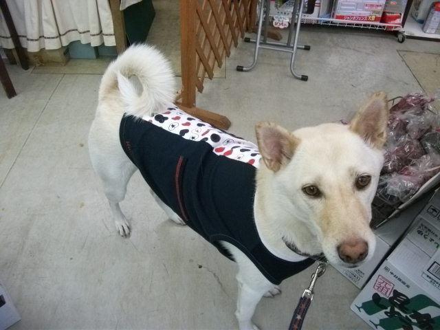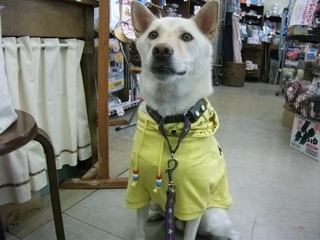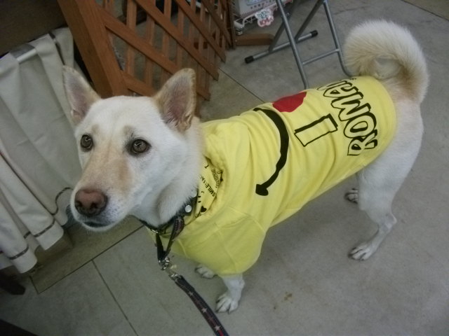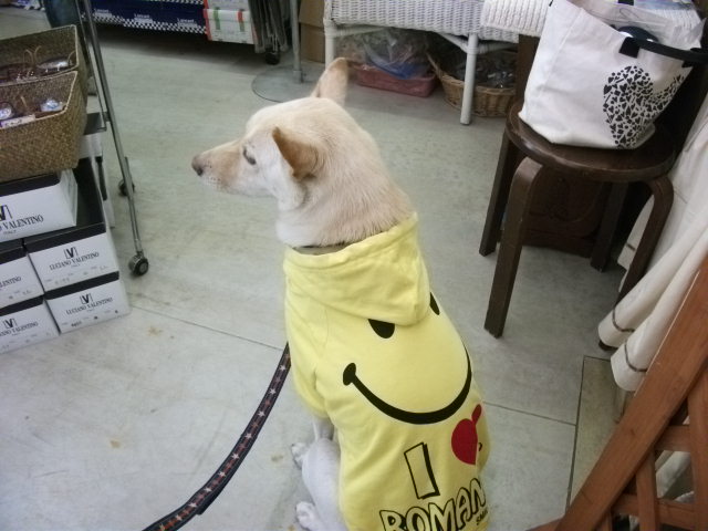人だったら着るのにとっても勇気が要りそうなハデハデスマイリー服も、犬服になれば